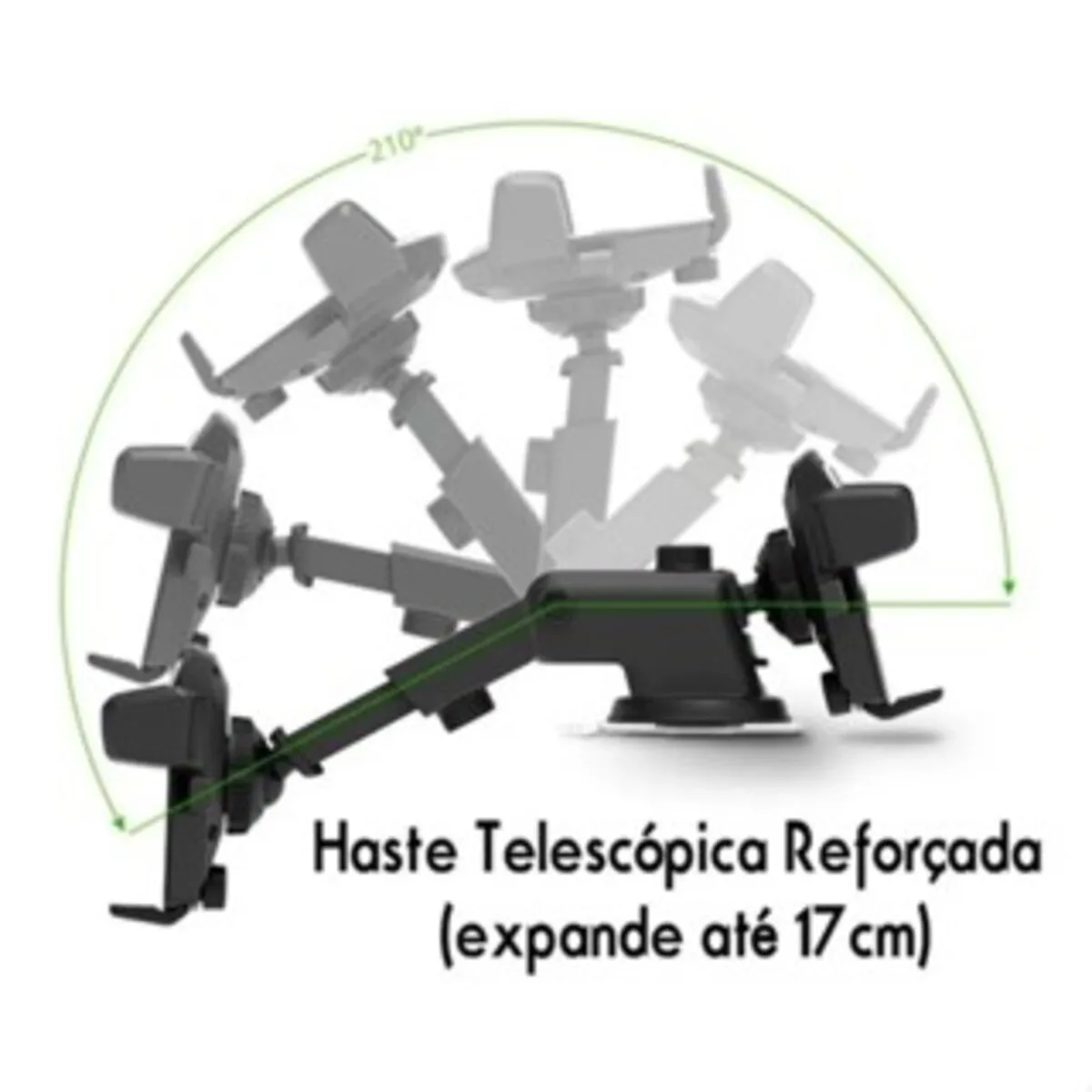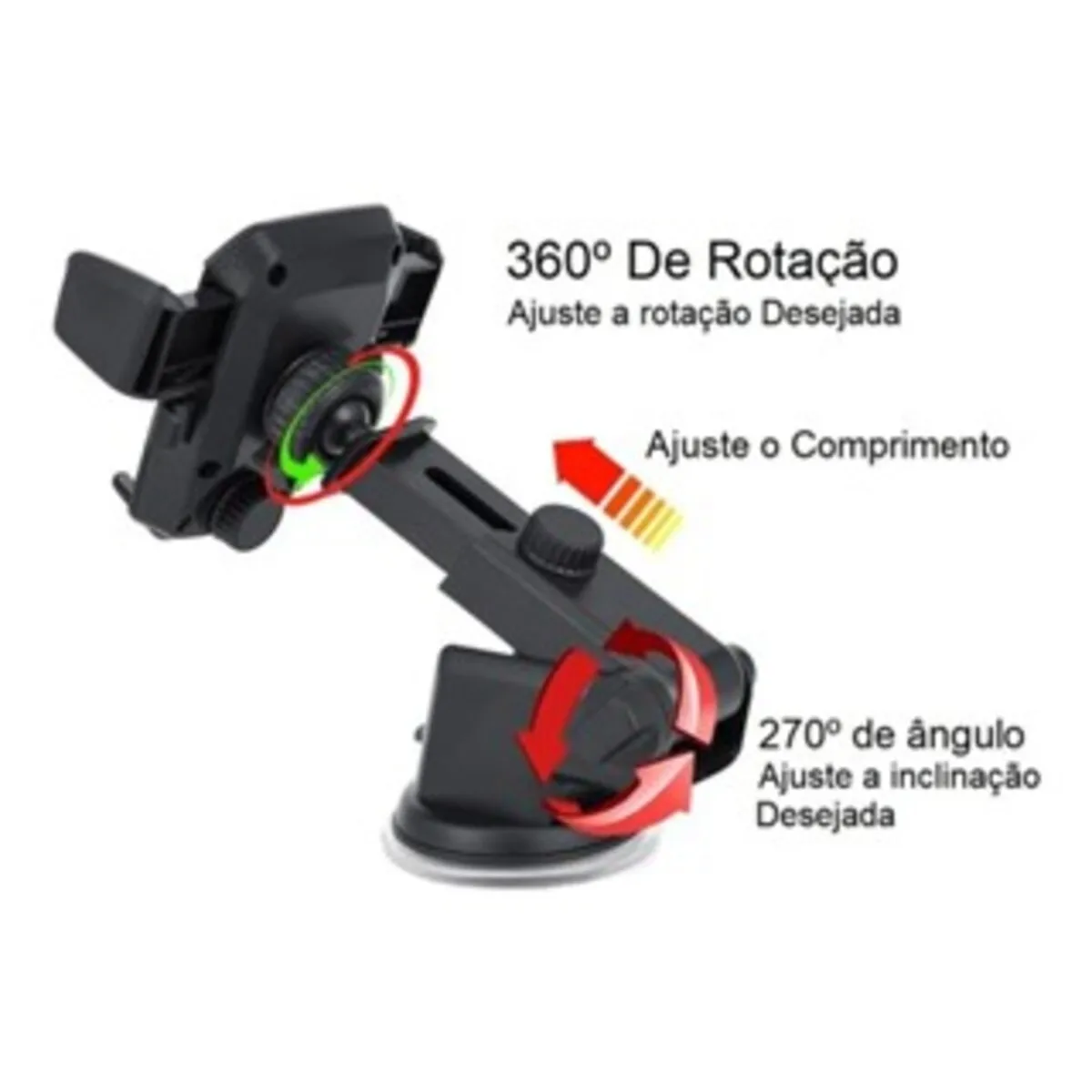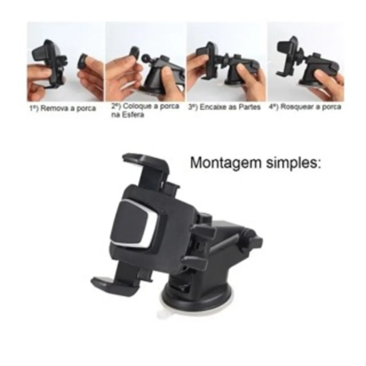 A fixação é feita por uma ventosa de silicone altamente aderente, que pode ser colocada tanto no vidro quanto no painel. Os ajustes possibilitam que o usuário customize o posicionamento da maneira que desejar, deixando o suporte na posição mais confortável e mais fácil de visualizar.